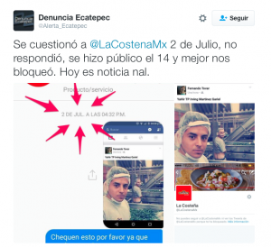 Mientras, la cuenta @Alerta_Ecatepec se puso en contacto con las cuentas de Twitter y Facebook corporativas de La Costeña el mismo día 2 de julio primero denunciando lo que ocurría con la foto difundida, a lo que no contestaron nada y… pasaron más adelante a bloquearles. Dos errores: esa cuenta en Facebook tiene 185.249 seguidores y en Twitter más de 21,3k, es un claro influenciador social con capacidad para movilizar en la zona donde está la fábrica, en Ecatepec de Morelos, dedicado a difundir denuncias sociales de todo tipo. No le hicieron caso.