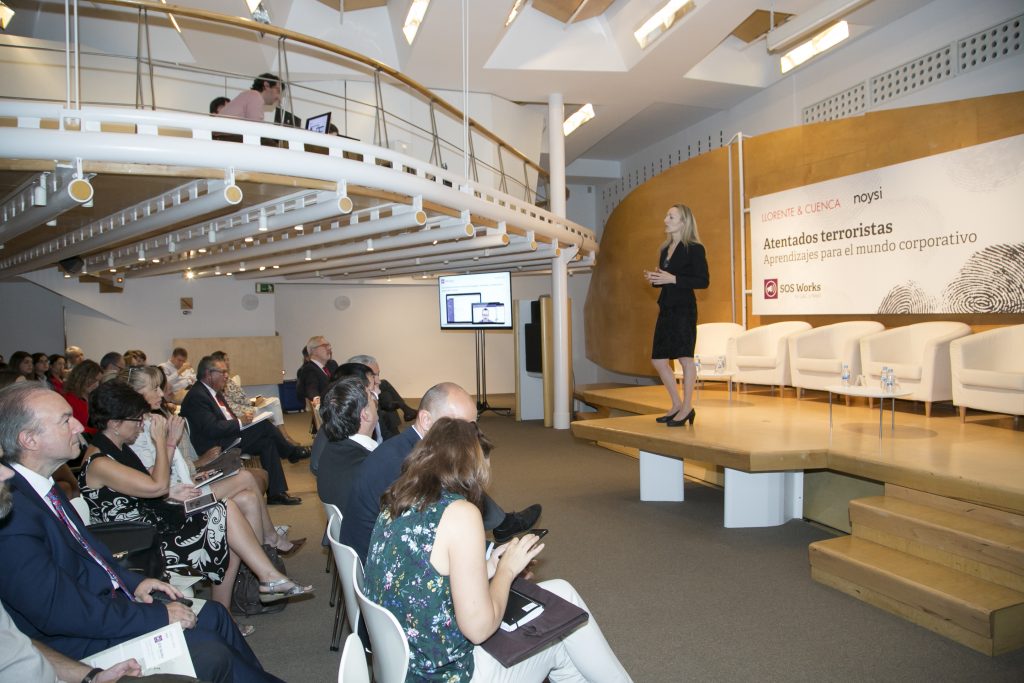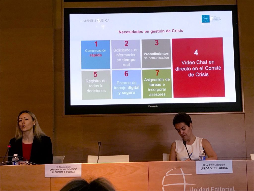 Natalia Sara en el evento de LLYC, Llorente y Cuenca, y Noysi donde se presentó SOS Works, en octubre 2017, una solución que permite pasar del comité de crisis tradicional al comité de crisis digital.