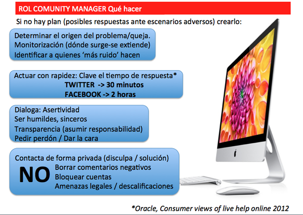 La actitud es la clave para su gestión. Muchos de los problemas de imagen que ocurren en las redes sociales se deben a errores del community manager: contestaciones inapropiadas, falta de información, no responder o no hacerlo en tiempo, etc., como ya expliqué en el post “Cómo sobrevive un community manager a las crisis” donde aportaba consejos básicos a seguir antes de tener un problema y durante la gestión del problema.