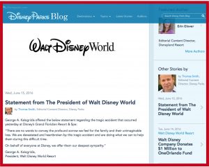 Comunicado oficial del presidente de Walt Disney World ante lo ocurrido en la muerte del niño de dos años y difundido en la web de blogs de los parques de atracciones.