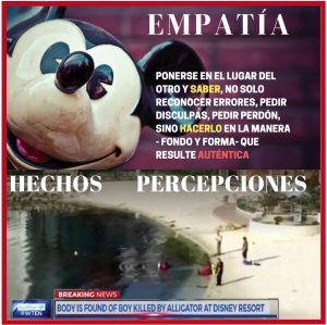 Ante lo ocurrido, no sólo la familia directamente afectada, todos tus clientes y la sociedad en general te pide dos cosas: que aclares las circunstancias de cómo y porqué ocurrió y cuáles son los protocolos de seguridad en este tipo de resorts, y por extensión en los parques. Pedir disculpas sinceras es clave en la gestión de la comunicación, y tarde o temprano, Walt Disney las va a tener que dar. El consumidor demanda cada día más información y este aspecto es “sagrado” cuando atañe a su seguridad, a su bienestar, se trate del tipo de negocio, producto, servicio, etc. que sea. Hasta que Walt Disney no lo haga de manera clara, persistirá la duda… y el riesgo de afectar su imagen y reputación, frente a lo que deberá seguir estos 5 aspectos combinados: