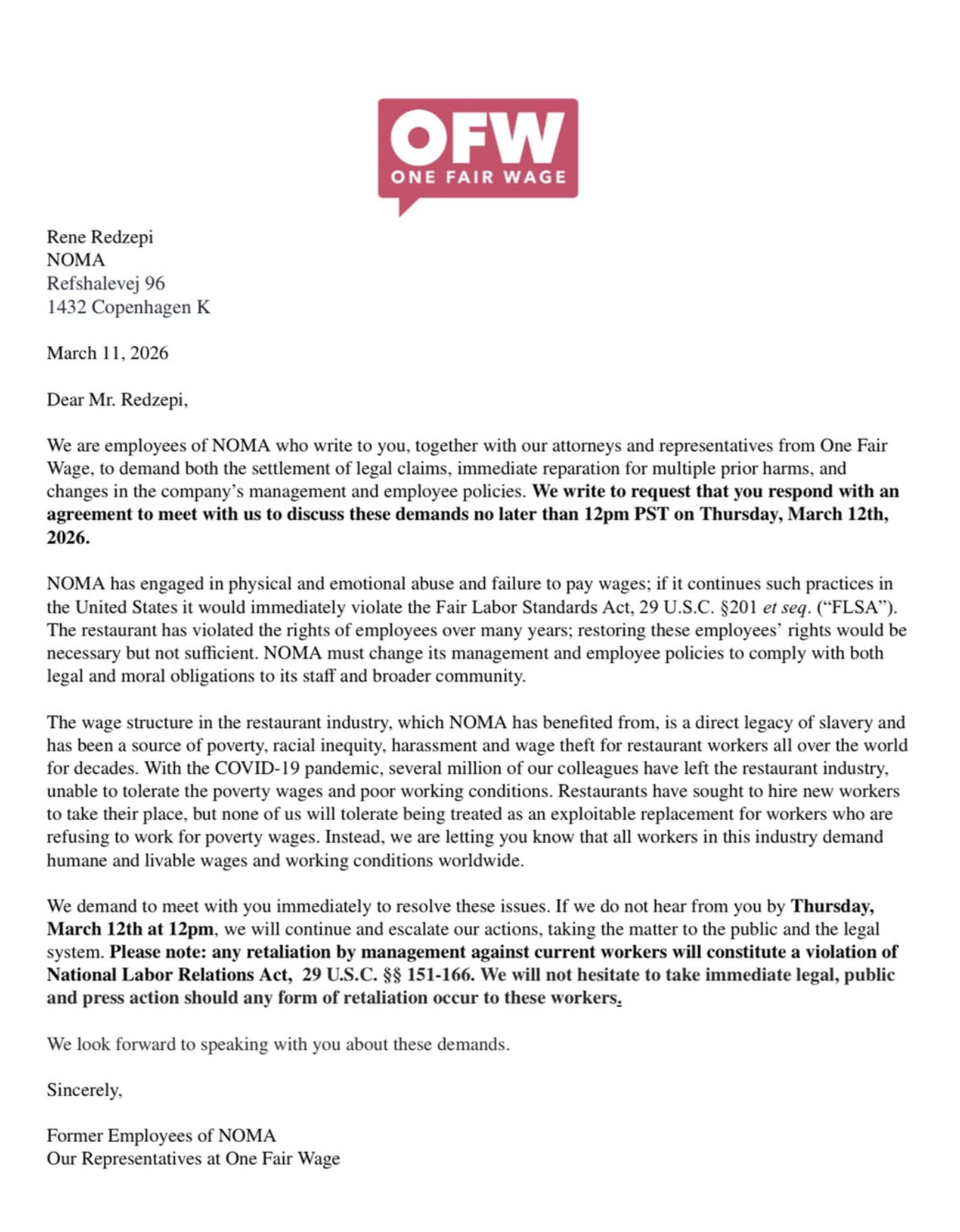 El 11 de marzo, fecha de inicio del primer y esperado servicio, estaba convocada una rueda de prensa y una manifestación de protesta a la entrada del restaurante. Ese día se mandó al chef y a Noma una carta legal de demanda firmada por extrabajadores y representantes de OFW, One Fire Wage, asociación activista que lucha por salarios justos en los restaurantes de todo el mundo. En la carta se pide, entre otras cosas, una reparación para las víctimas y la dimisión de René. Y dicen que las protestas continuaran mientras no se sienten a negociar.